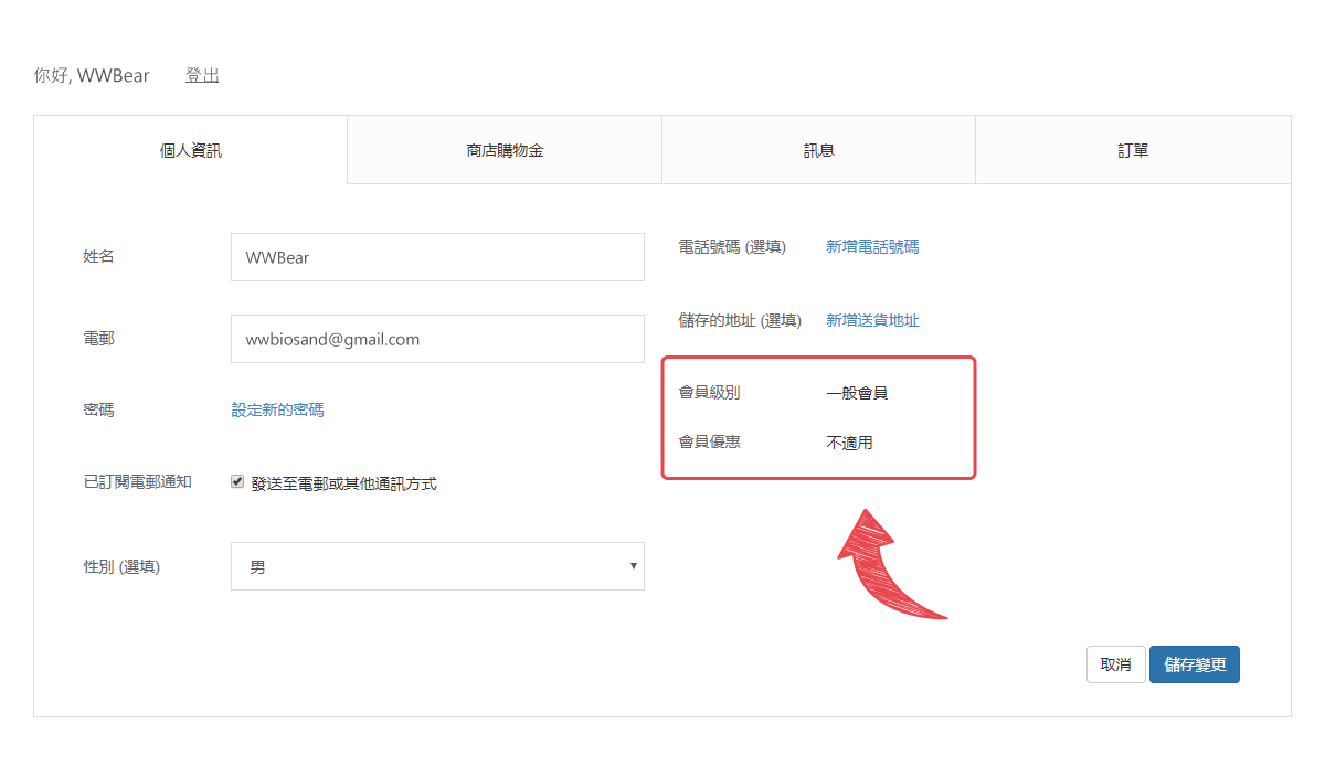 3. 會員升級的金額是以「已付款」的訂單狀態為基準,如果訂單是「已取消」的狀態將不會計入累積。