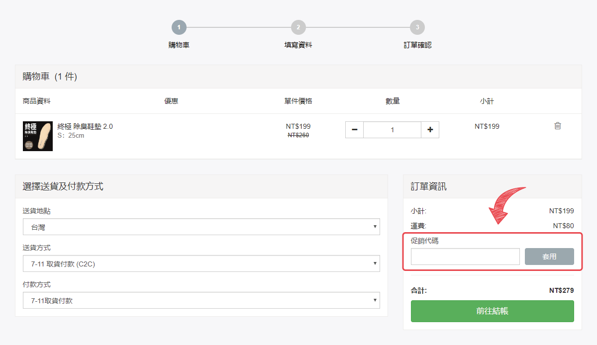 結帳時,請在購物車頁面的右下角點擊「輸入促銷代碼」,輸入完畢點選「套用」即可享有優惠。