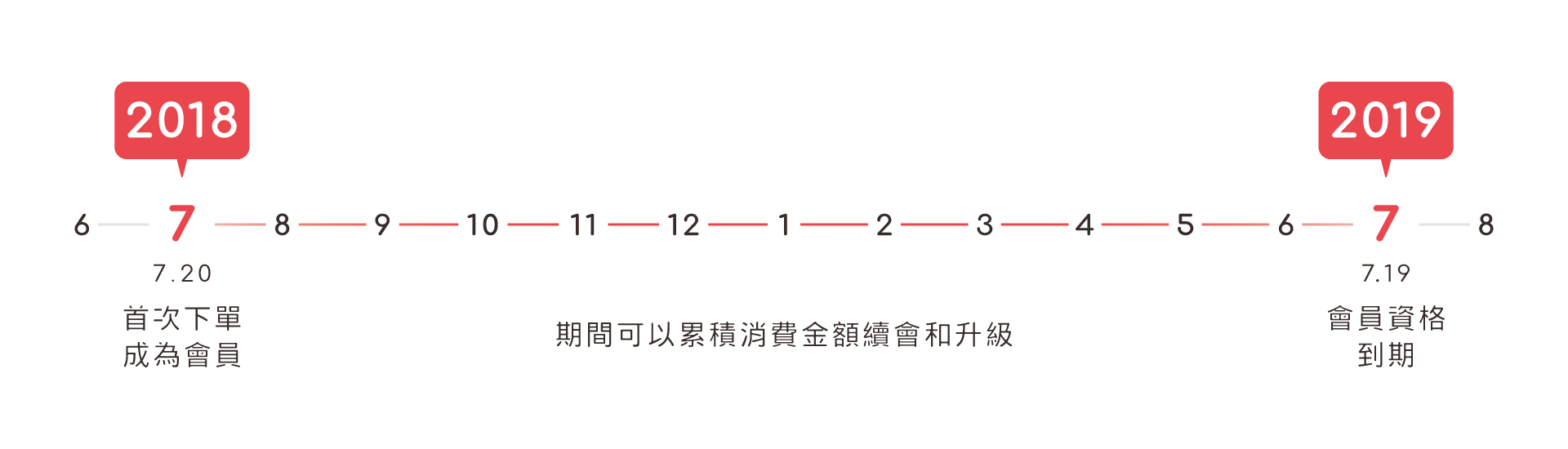 除了【無】會員是終身會籍,【味】、【熊】會員不論任何時間成為會員,之後 12 個月內都能保有該等級的會員資格,期間可以累積消費金額續會和升級。反之,如果 12 個月內累積金額沒有達到續會門檻,就會自動降級囉。